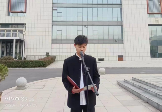 升旗仪式结束后,2023地质调查与矿产普查4班许跃军作为员工代表在国旗下进行了《安全无小事,责任重于山》主题演讲,他从学习和生活方面的安全隐患着手,向大家提出6条建议。作为员工代表承诺遵守公司的规章制度,向全体同学发出“提高安全意识,树立安全重于泰山,生命高于一切的观念”的倡议。