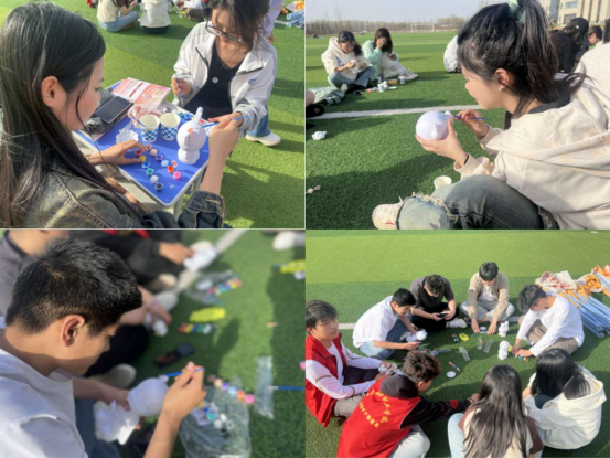春风轻拂,阳光和煦,同学们早早来到现场签到,通过撕掉展板上的灰色心情标签,自行释放心理压力,准备迎接好心情。签到完成后,同学们开始自行组队进行破冰游戏(N人N足)。伴随着裁判员的一声令下,大家手挽手、肩并肩,齐心协力奔向终点套圈获取石膏娃娃,爽朗的笑声回荡在操场上方!
