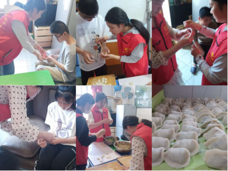 活动当天,志愿者们早早来到陇海大院社区,看望这里的五位盲童。她们利用自己的专业特长,现场教盲童们编织手绳,鼓励孩子们在公司努力学习。拉近了彼此的距离之后,志愿者们带领盲童一起揉面、擀皮、包饺子,志愿者们手把手耐心地为盲童讲解步骤,边干活边聊着近期的学习生活,现场一片欢声笑语,洋溢着温馨、祥和的氛围。
