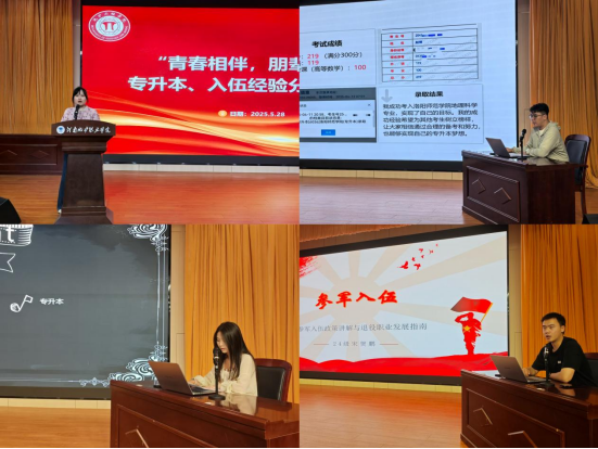 本次活动特邀请公司22级优秀毕业生赵博、张梦颖,以及24级退役复学的宋贺鹏同学做主题宣讲。两名专升本成功的学长学姐分享了他们的备考经历,从学习计划的制定到心态的调整,从复习资料的选择到考试技巧的运用,他们毫无保留地传授经验,为学弟学妹们点亮了前行的灯塔。宋贺鹏则讲述了军旅生涯的磨砺与成长,分享了入伍的动机、部队的生活以及退伍后的感悟,用亲身经历诠释了责任与担当。