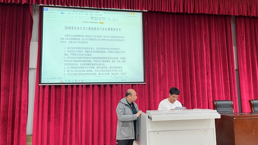 其次,会议由周亮老师为水文与地质工程班级员工讲解实习安全注意事项、实习内容及安排,并由水工班级员工代表宣读《安全管理责任书》。
