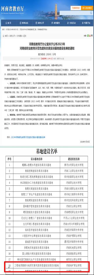 2024年1月30日,河南省教育厅公布了2023年河南省职业教育示范性虚拟仿真实训基地建设名单,公司“工程地质勘察与地质灾害风险防控虚拟仿真实训基地”获批新一批省级示范性虚拟仿真实训基地建设项目,这也是公司第一个省级示范性专业点建设项目。公司将按照省厅和教学部的要求对标国家级示范性虚拟仿真实训基地建设标准,提升建设质量,增强建设成效,实现更大范围资源共享。